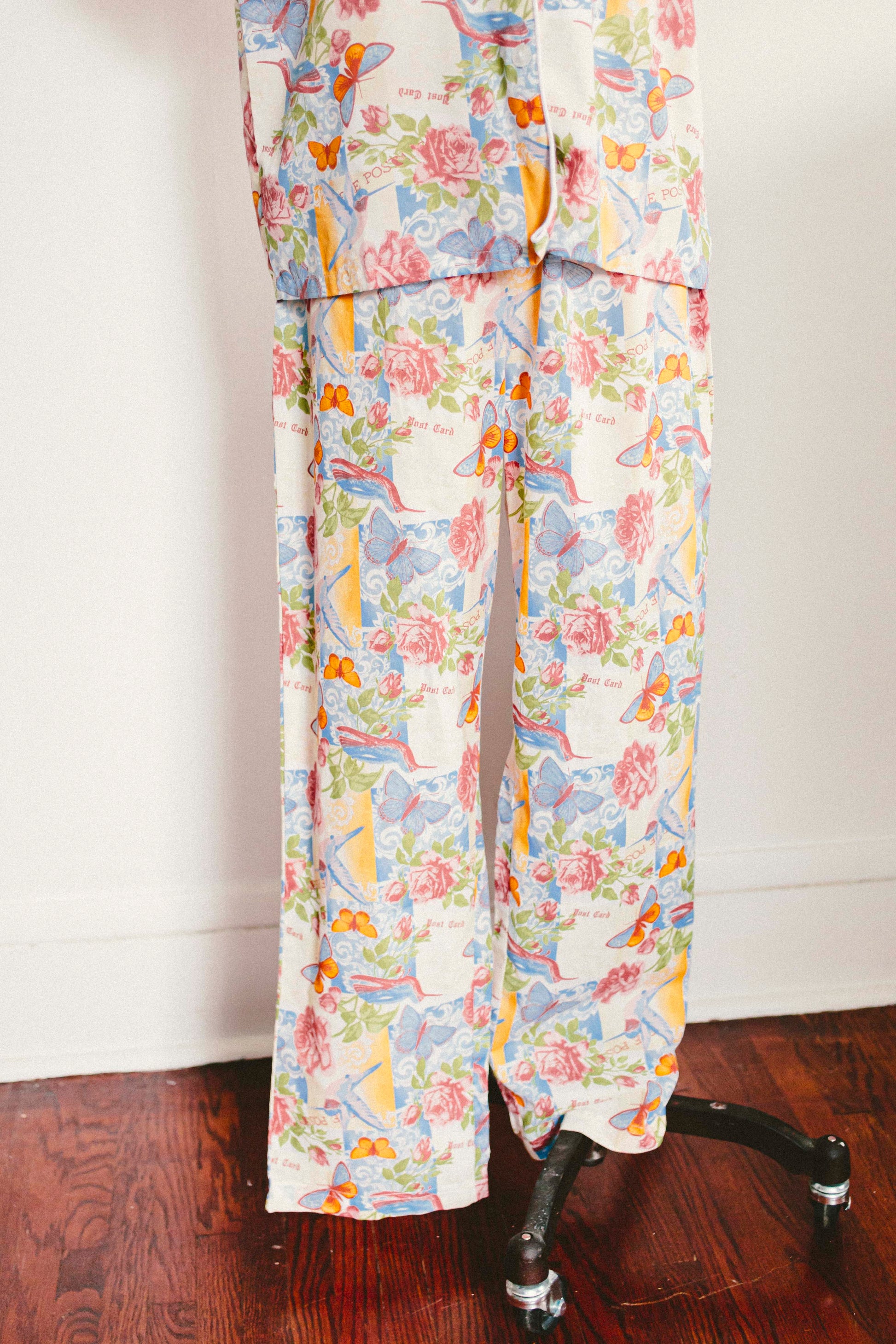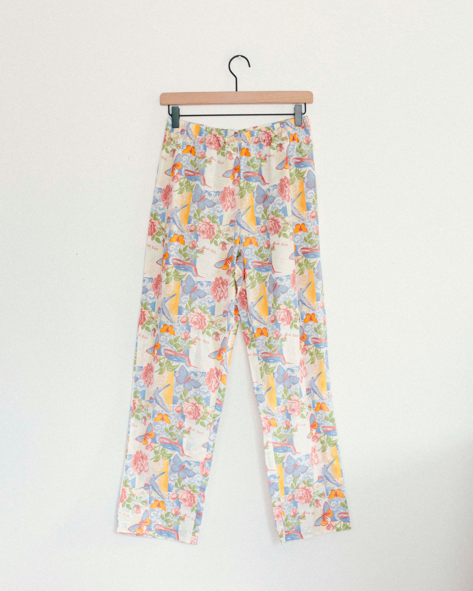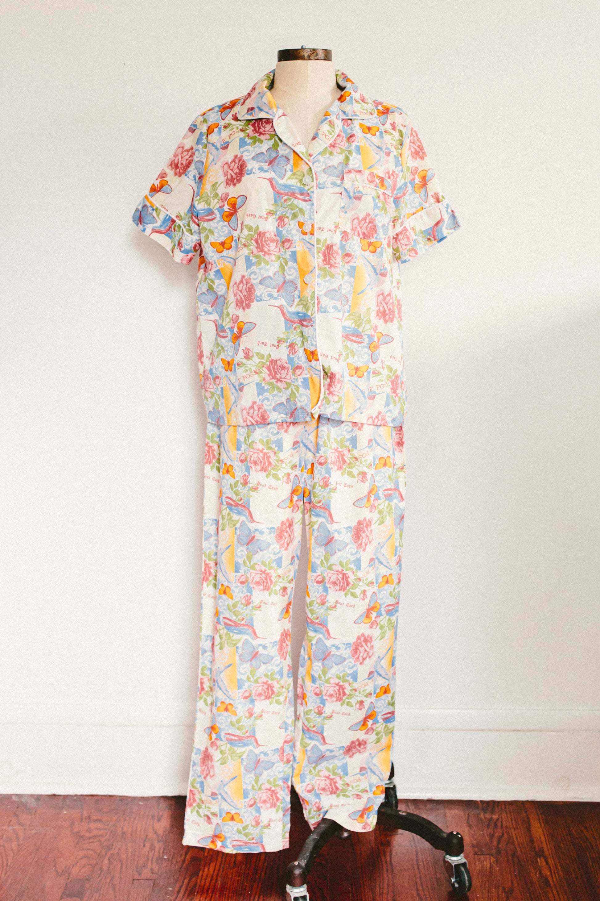Vintage matching shirt and pant set. Pants are high waisted with an elastic waistband.