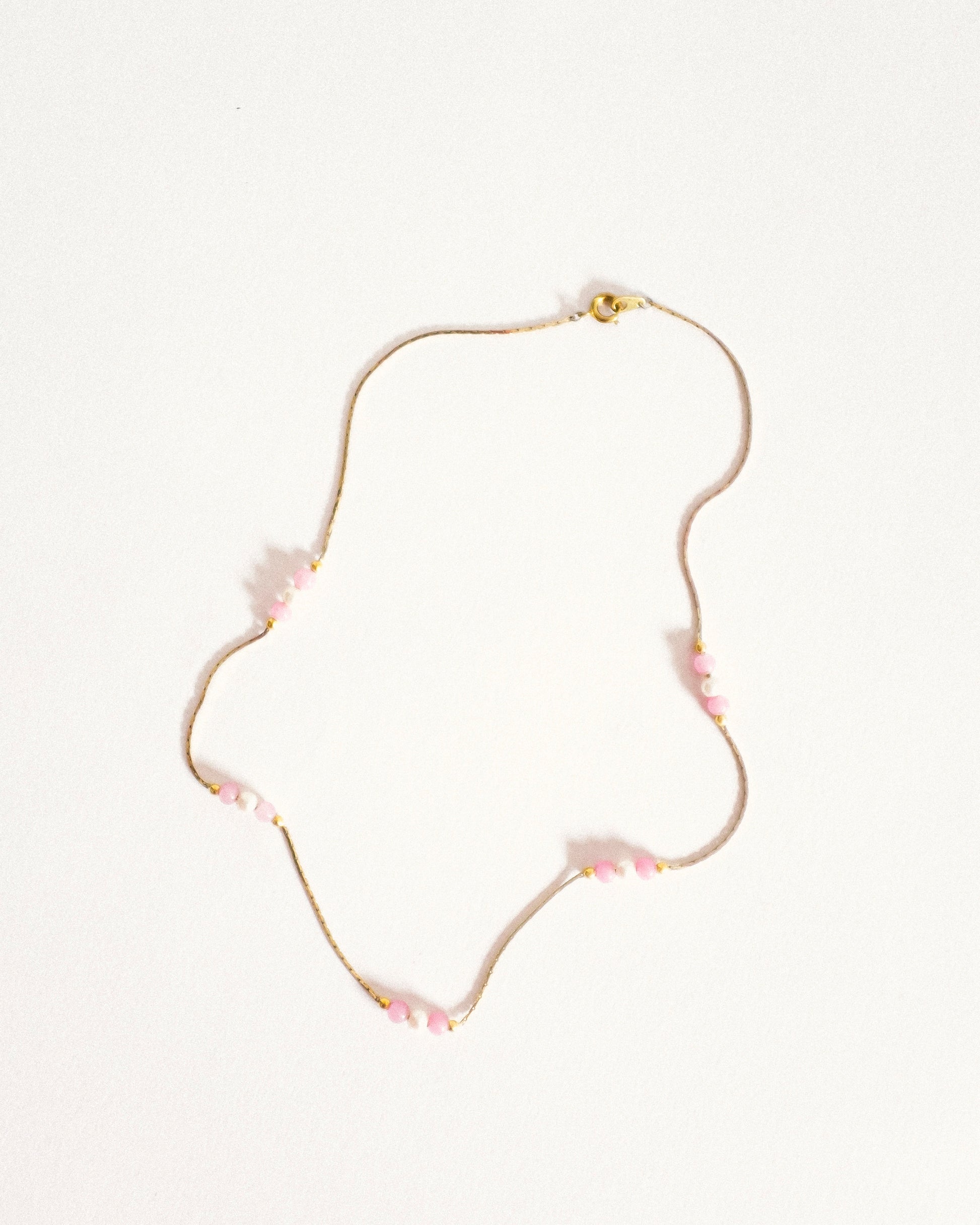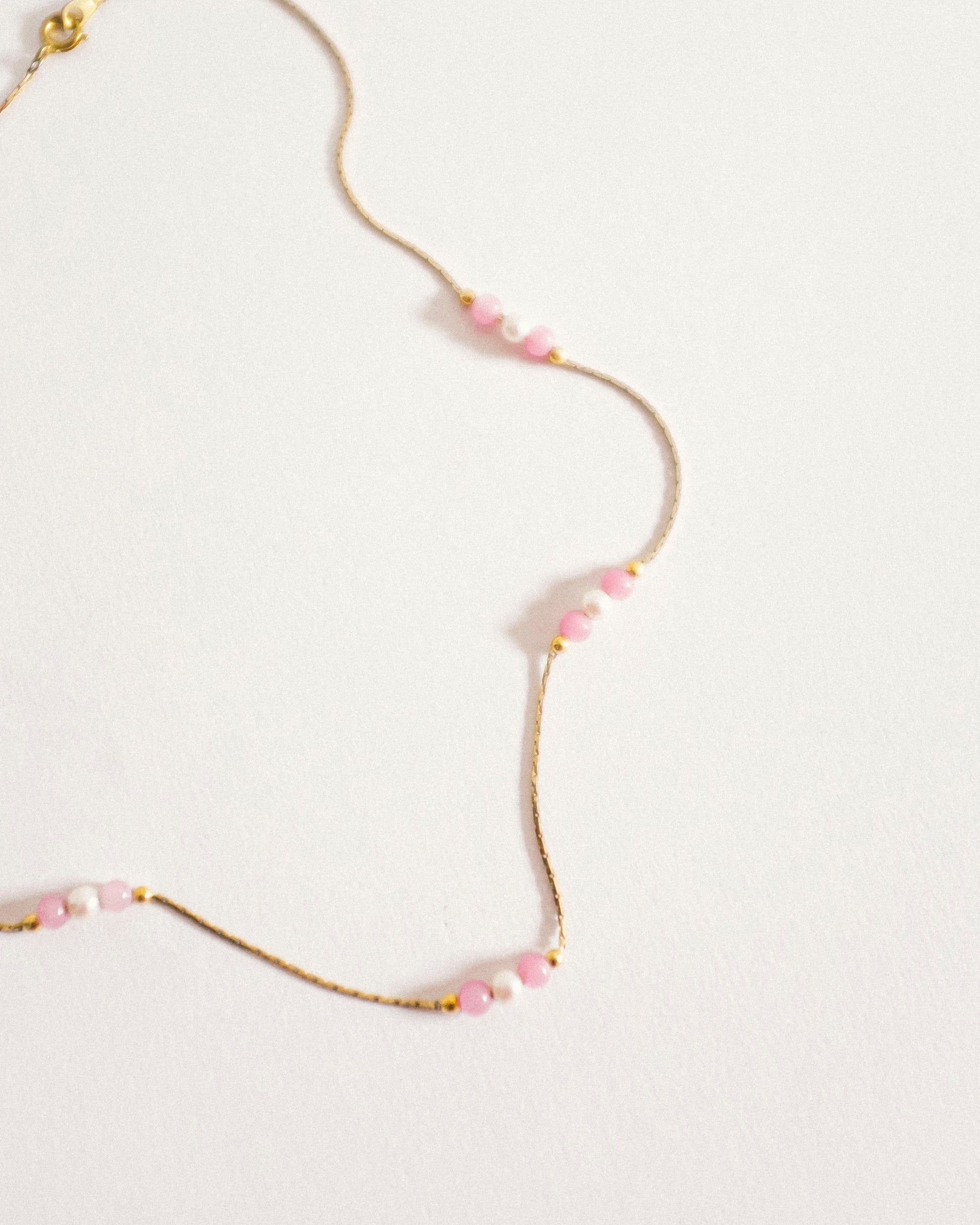 Vintage 1960/70's brass chain necklace with faux pearls and pink beads.
