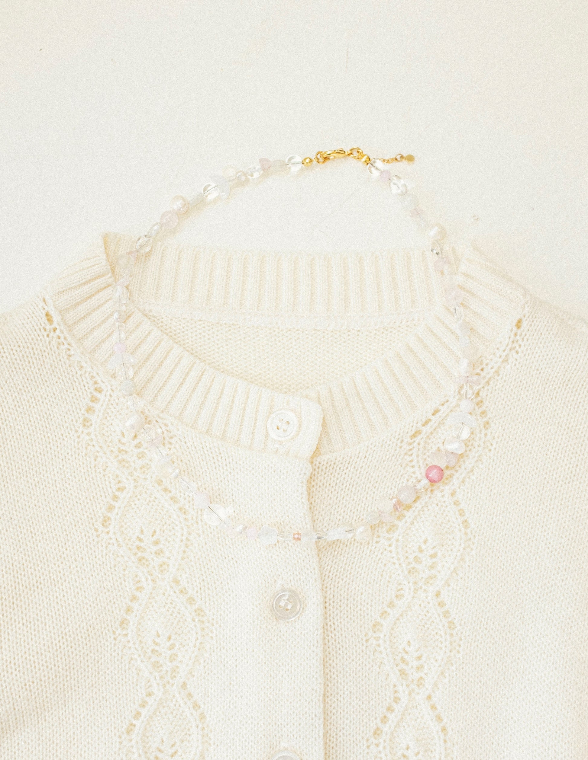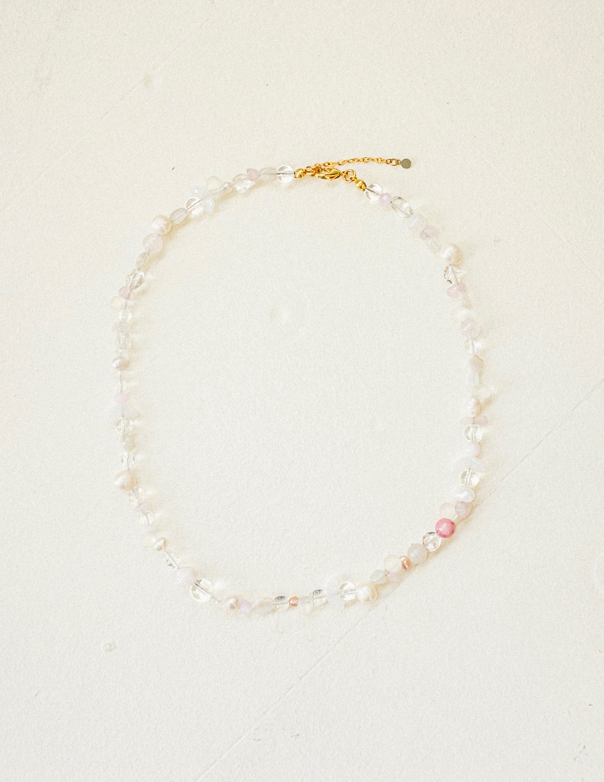 - Rose + crystal quartz beads, freshwater pearls, mother of pearl and glass beads
