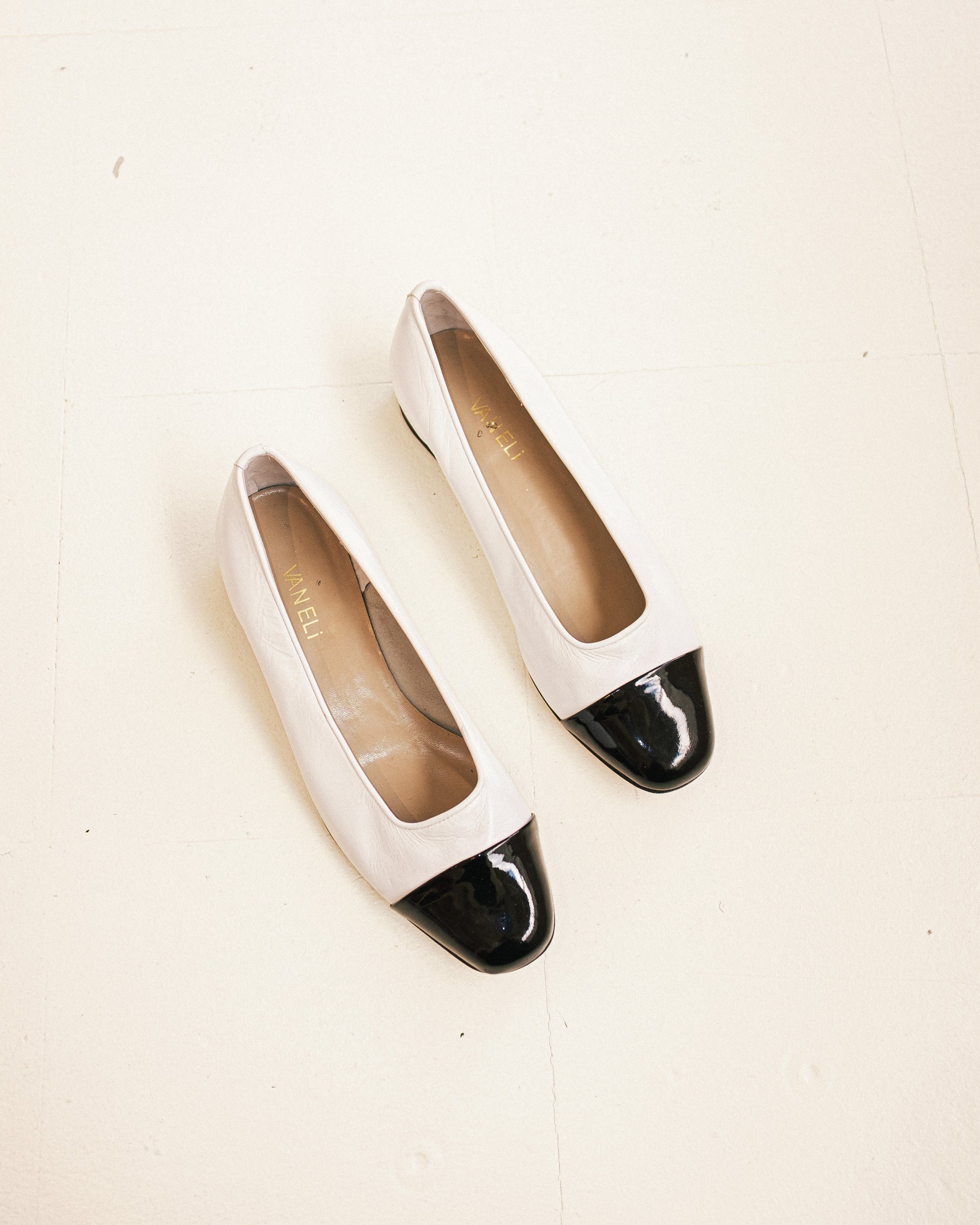 Vintage leather flats with patent accents.