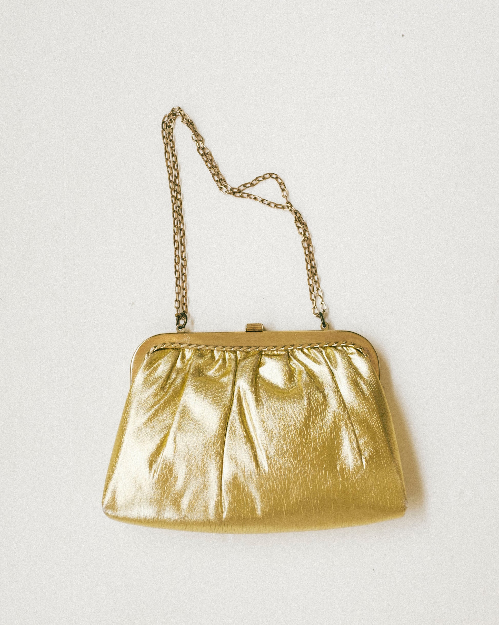 50/60's gold fabric clutch with gold metal hardware and optional chain handle.