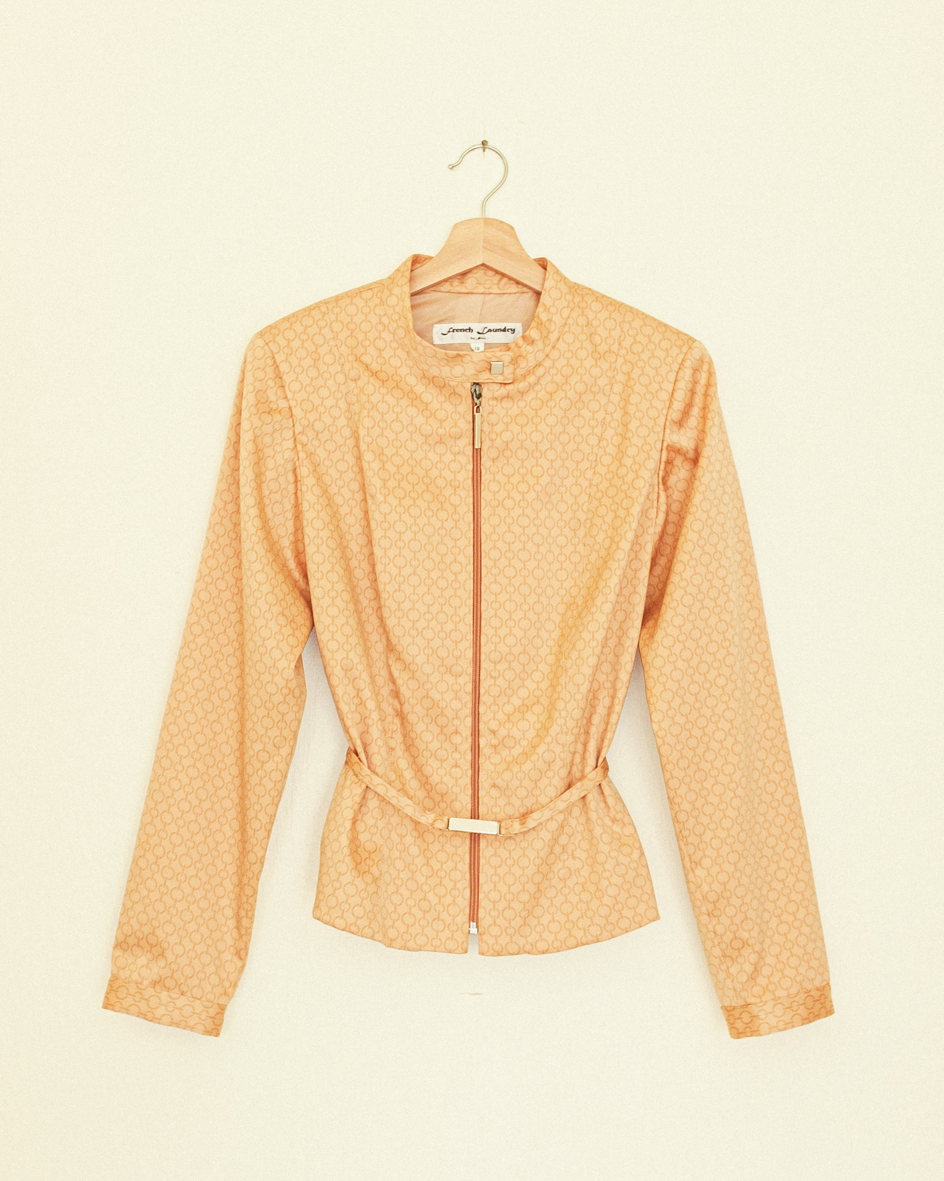 Satin moto jacket with optional belt. Light shoulder pads.