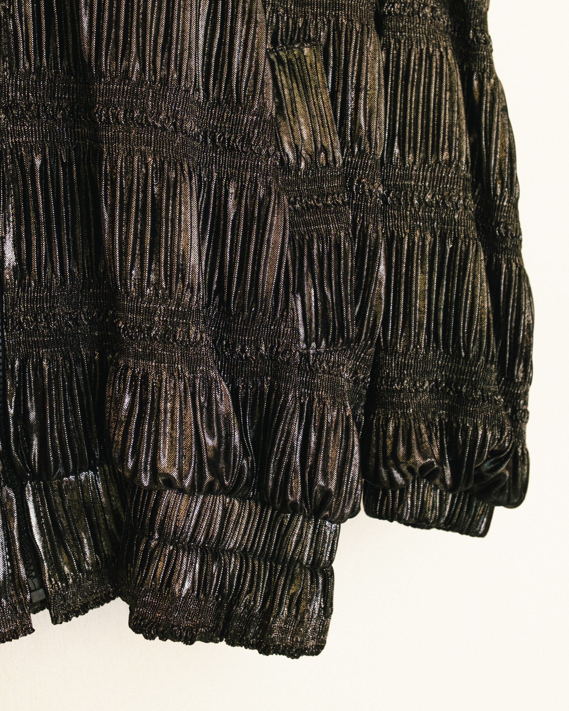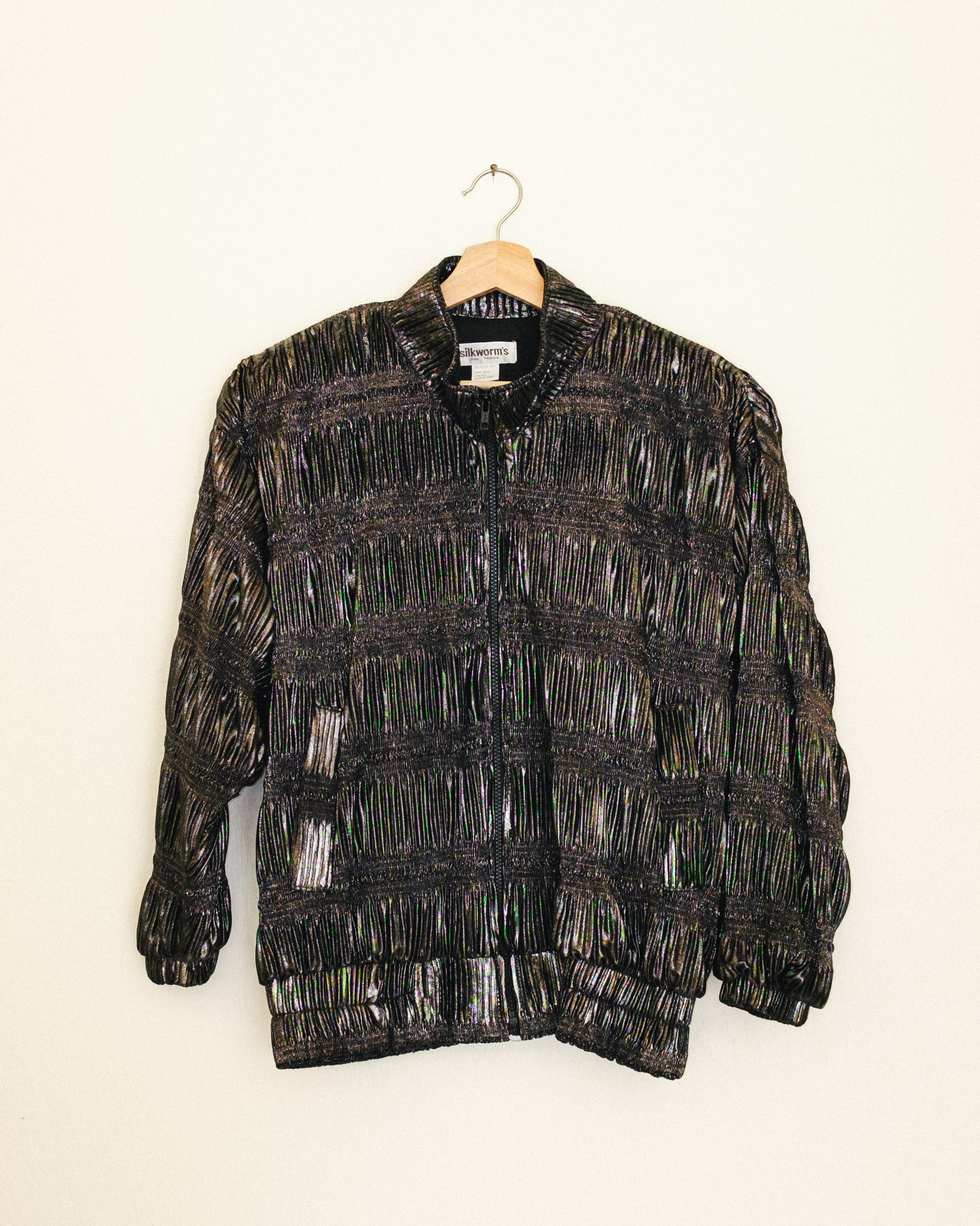 Vintage shiny textured bomber jacket with light shoulder pads.