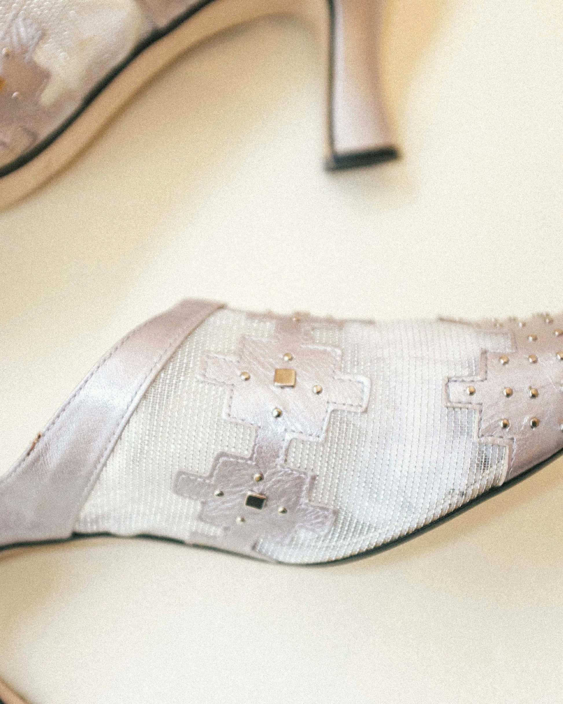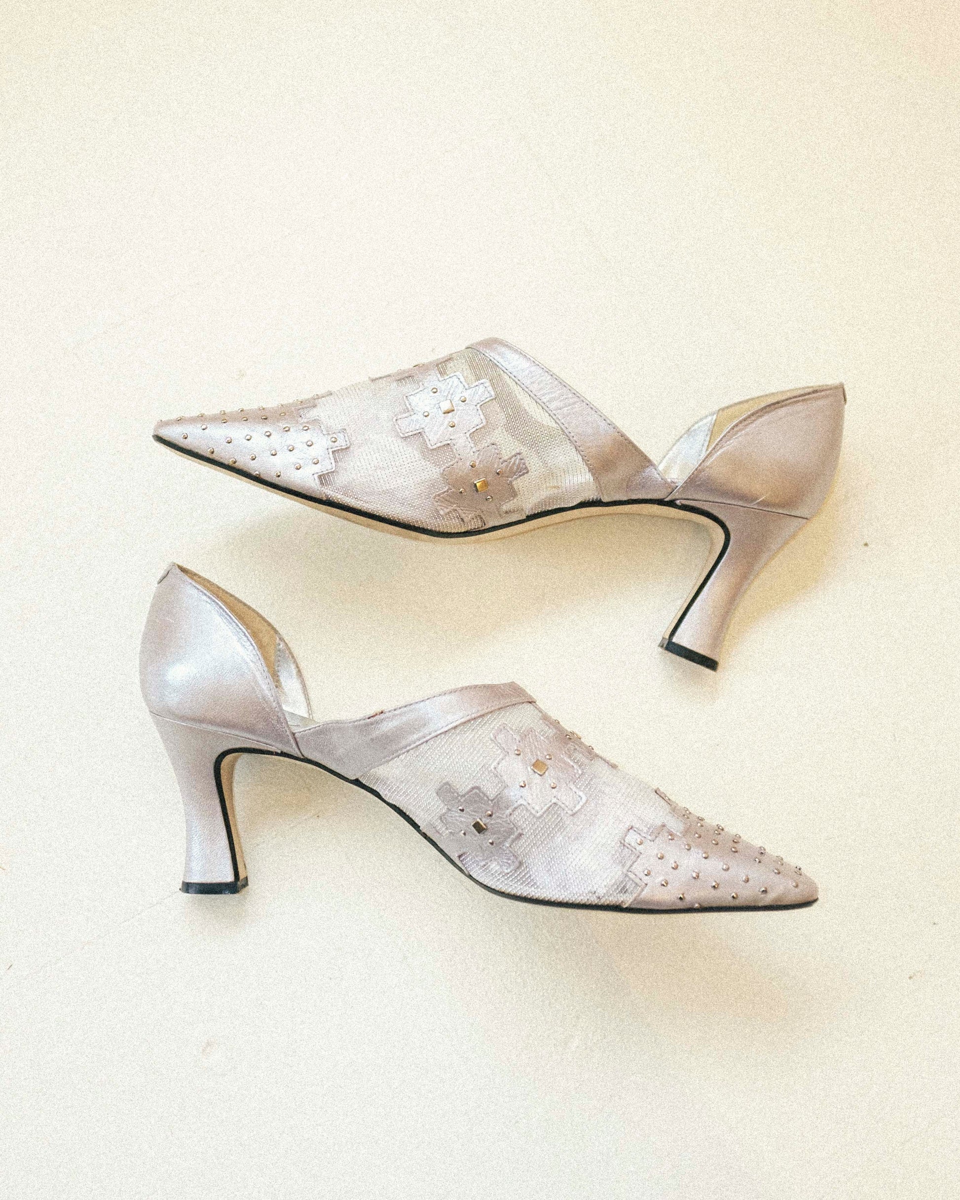 90's silver leather and mesh pumps with metallic details.